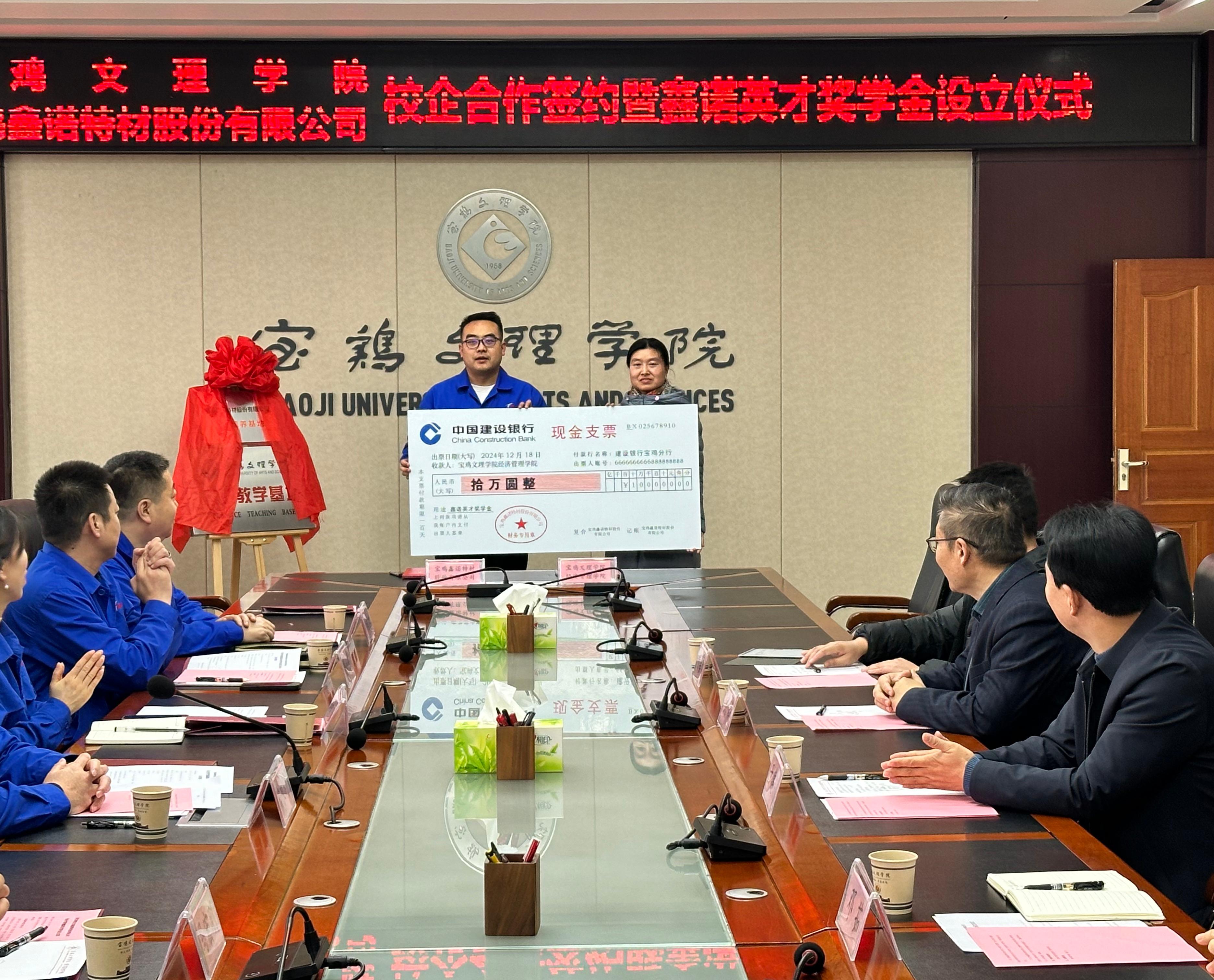 12月18日,寶雞鑫諾特材股份有限公司與寶雞文理學院校企合作簽約儀式暨鑫諾英才獎學金設立儀式在寶雞文理學院圖書館舉行。寶雞文理學院副校長于建偉、經濟管理學院領導及學生代表,鑫諾特材黨支部書記、董事長鄭永利及高層管理人員出席了此次儀式。